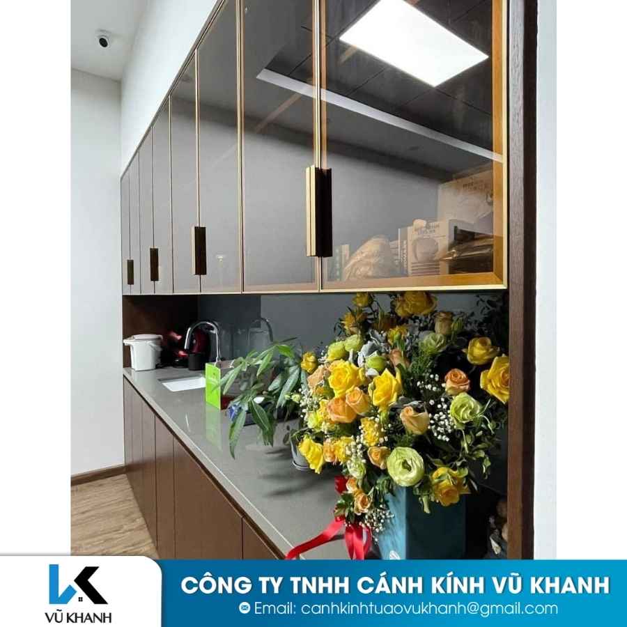 Tiếp nhận nhu cầu về tủ cánh kính sử dụng các nguyên liệu nhập khẩu hệ cao cấp, Cánh kính CÁNH KÍNH TỦ ÁO VŨ KHANH Đã giao mẫu tư vấn và lên thiết kế chốt đơn hàng cho một vị khách lắp đặt tại biệt thự sân vườn quận 2 Hồ Chí Minh về hạng mục tủ bếp hiện đại sử dụng khung nhôm cánh kính.
